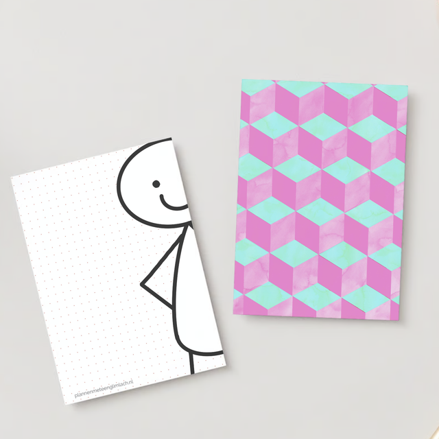 De blokken zijn dubbelzijdig geprint met op de achterkant van elk vel een vrolijk patroon.